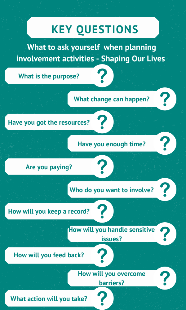 To find out more about these key questions, read the guide: Some key questions for inclusive involvement (PDF)